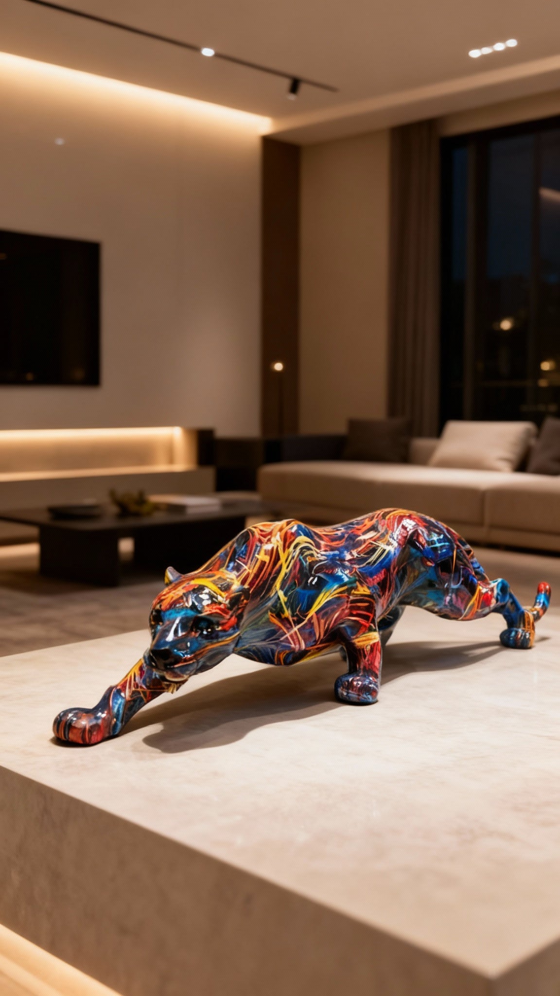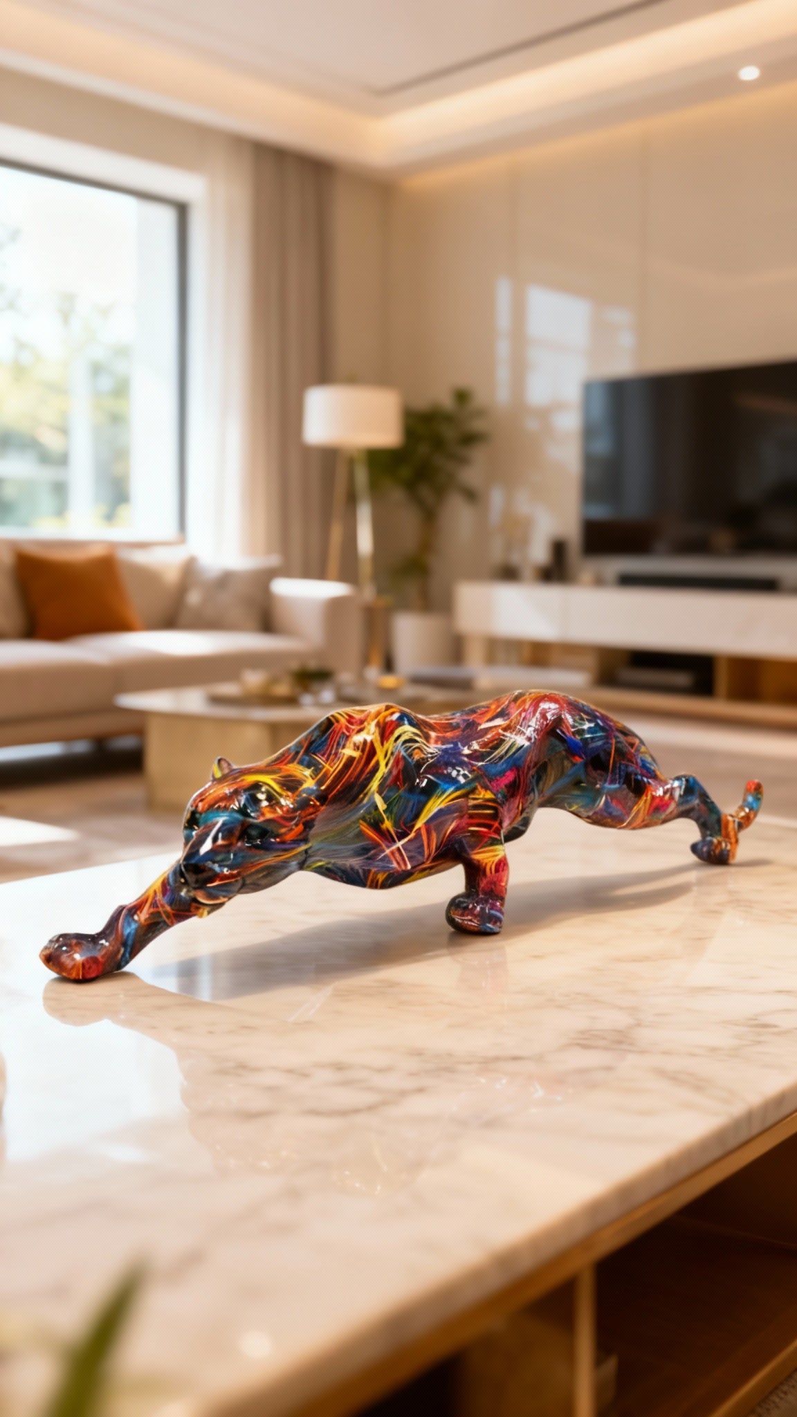 Apportez une touche artistique et moderne à votre décoration avec cette statue de léopard abstraite en résine colorée.