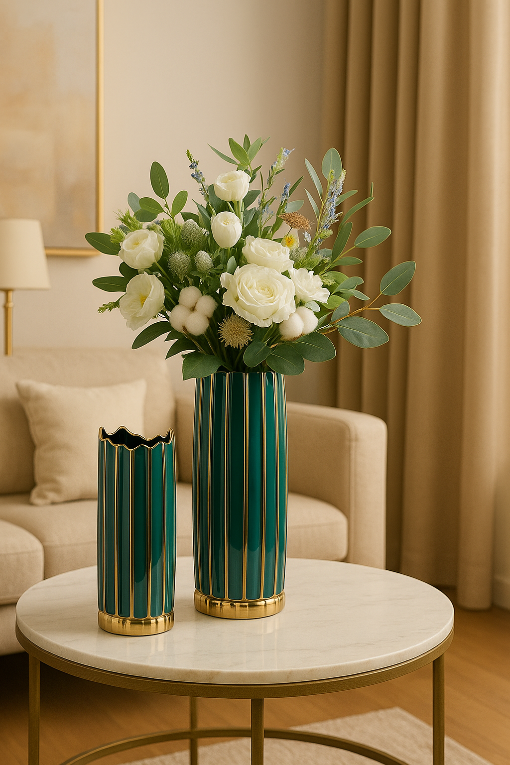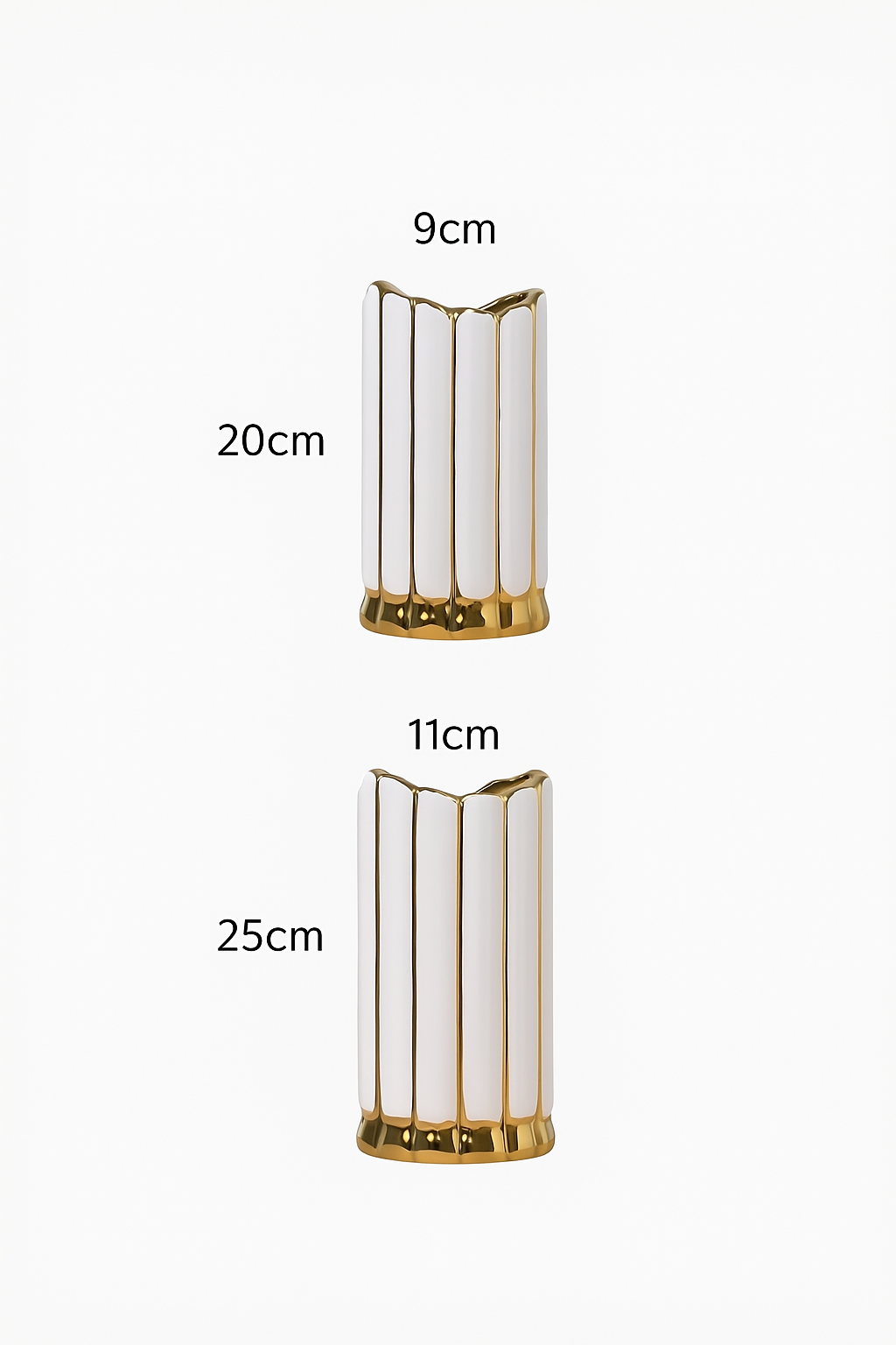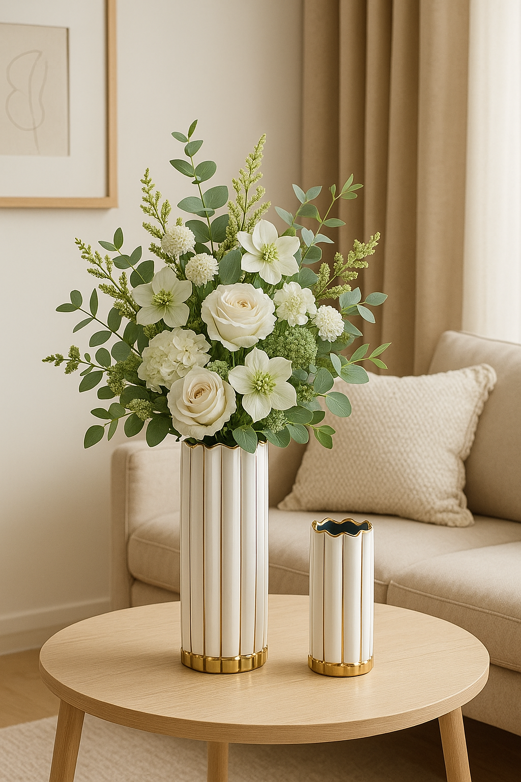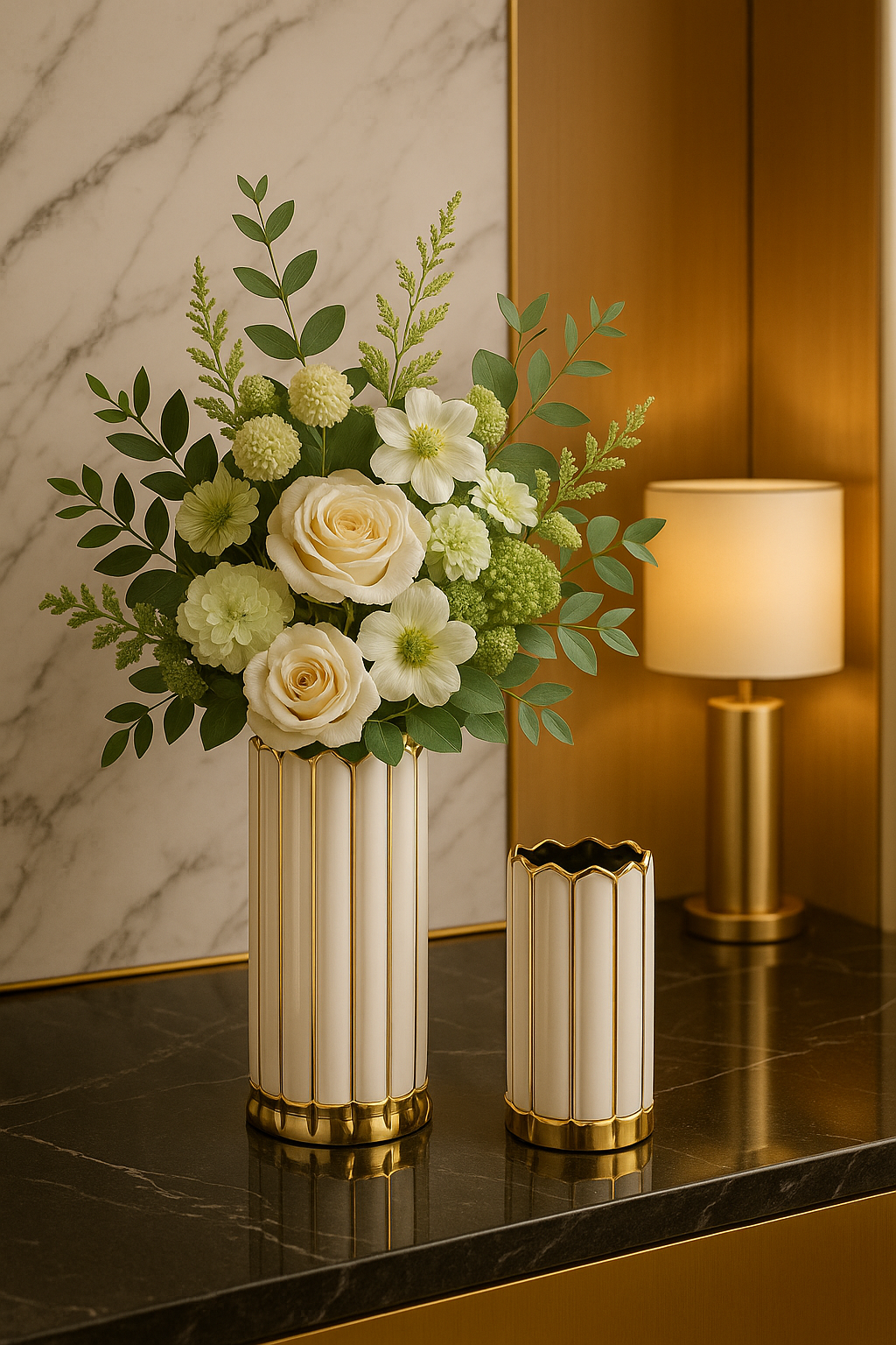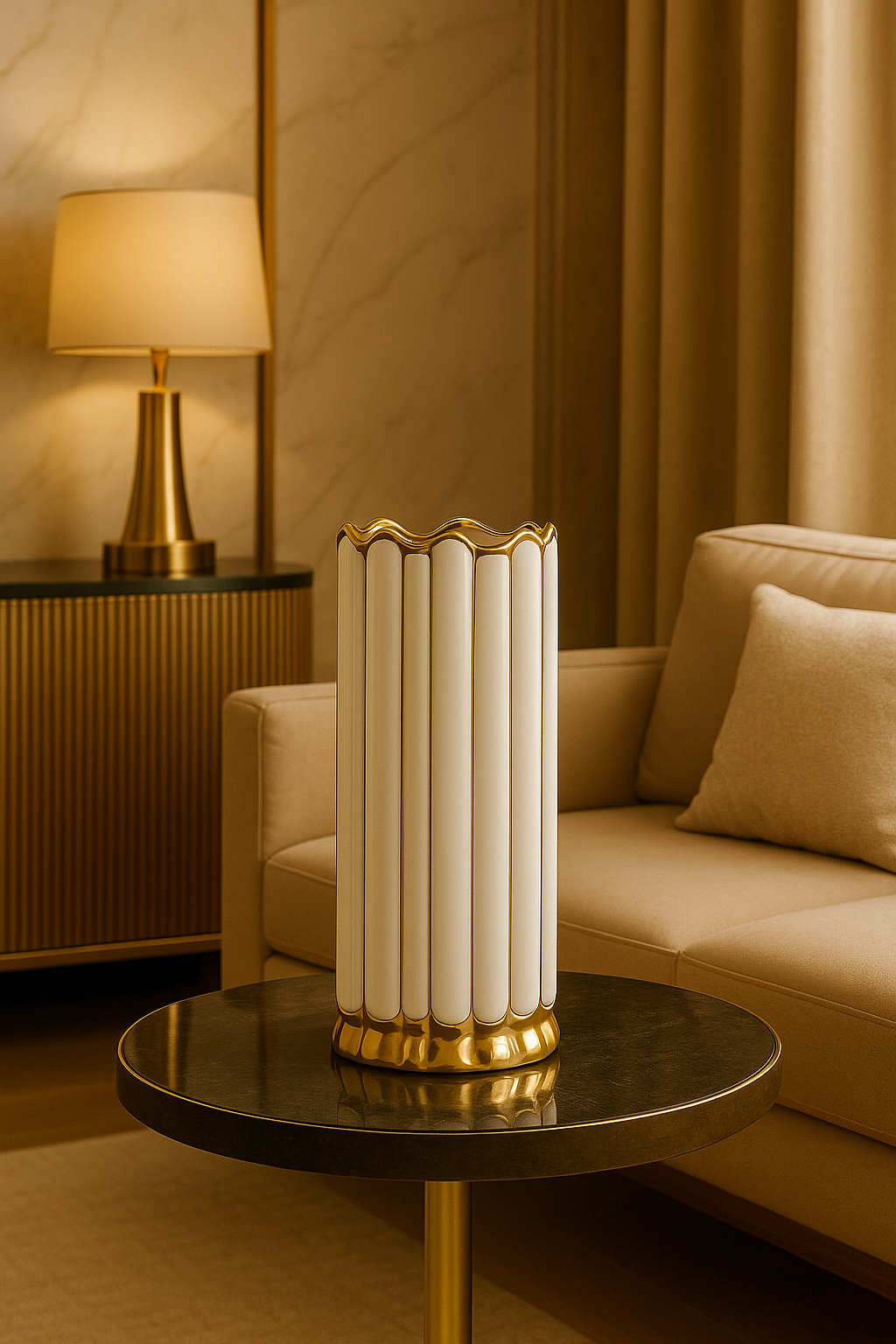 Apportez une élégance contemporaine à votre intérieur avec le vase en céramique « Aurora ». Sa silhouette ronde et ses délicats détails dorés s’harmonisent avec tous les styles, du minimalisme nordique au design moderne. Fabriqué en céramique durable avec une finition impeccable, ce vase met en valeur fleurs séchées, bouquets frais ou branches décoratives. Plus qu’un simple contenant, « Aurora » devient un véritable objet d’art qui sublime meubles, consoles et tables basses avec raffinement.